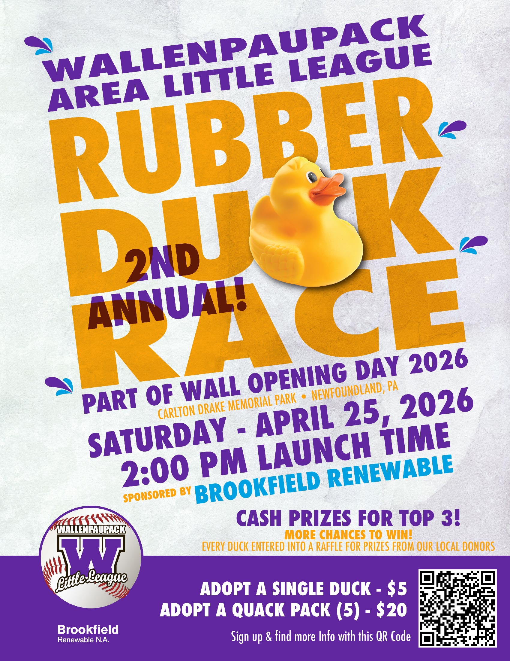 1) All "adopted" ducks will be uniquely numbered. 2) First 3 ducks across the finish line win the cash prizes. 3) NEED NOT BE PRESENT TO WIN. Winners will be announced April 25, 2026 as they swim into the park, and will be notified by email/phone within 3 days if not present to collect their winnings. 4) You are buying a chance to win prizes, not the purchase of the duck. Ducks remain the property of Wallenpaupack Area Little League to be used in future years. 5) Once the ducks are launched, they are on their own. No attempts to free them or force them downstream will be permitted. 6) Duck adoptions will end April 24, 2026 at 8:00pm in order to prepare them for their big swim. 7) If your payment is not received by April 24th, your ducks are ineligible to race or win prizes. 8) A list of the numbered ducks, and their adopted person or organization's name will be posted at the Concession Stand prior to the race. Identification will be required to claim any prizes. Prizes not claimed by June 1, 2026 are considered donations to the League.